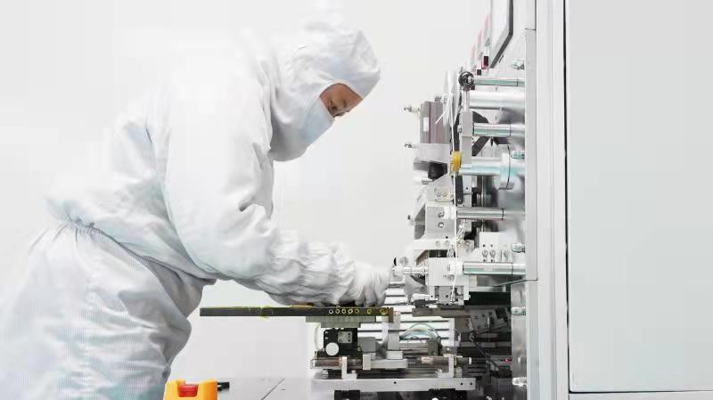 ? ? ? ? 2月9日,高新區(qū)松柏電子生產(chǎn)車間,2名工人合力將一張86寸觸摸屏移下操作平臺。